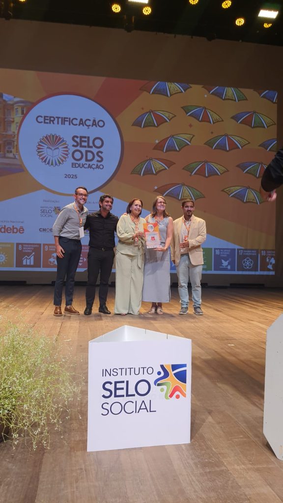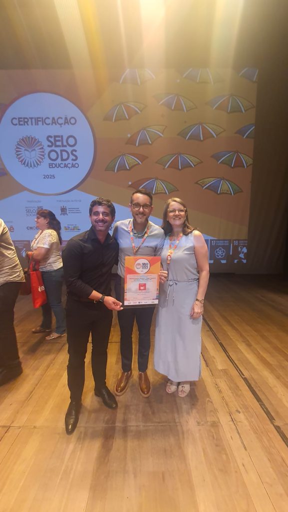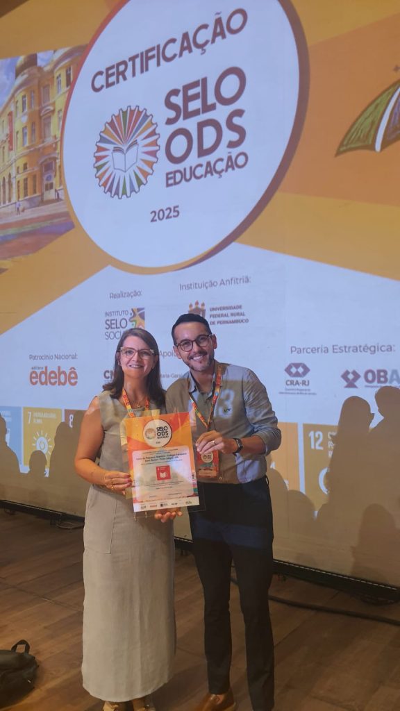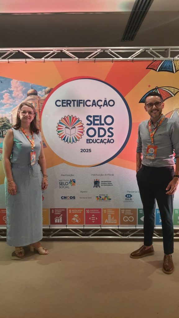 Nos dias 17 e 18/03/26 a Diretora Executiva do Colégio Dom Bosco, Flávia Costa Mentges, esteve em Recife-PE, acompanhada do Coordenador Pedagógico do Ensino Médio e Cursos Técnicos, Alexsandro Possatto. Eles representaram o Colégio na Cerimônia Nacional de Certificação do Selo ODS Educação.
