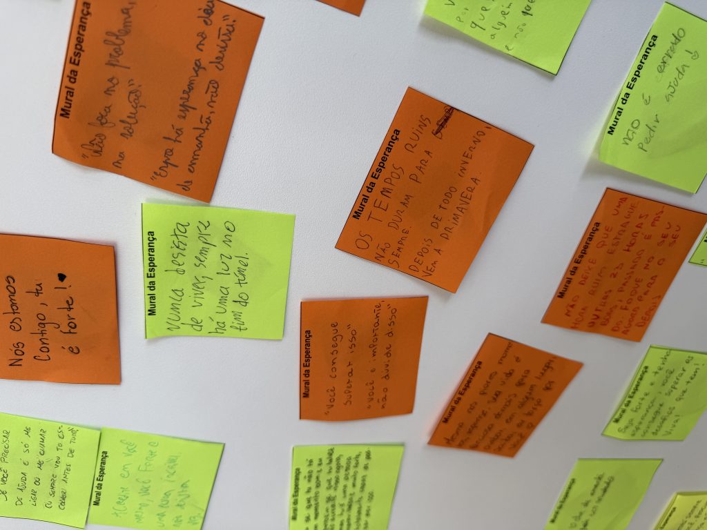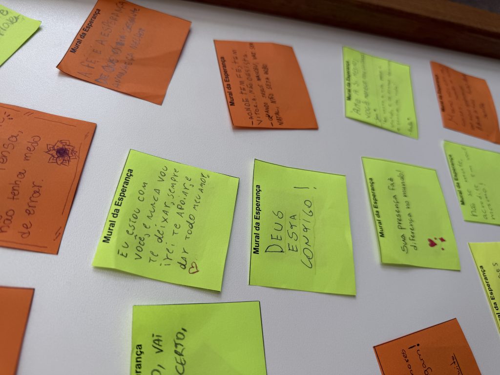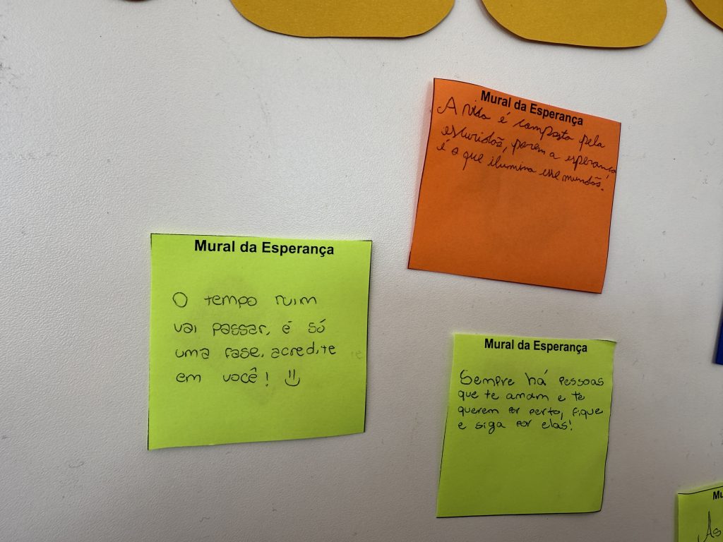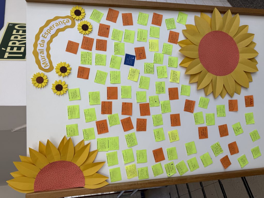 “É papel da Orientação oferecer estratégias e possibilidades de reflexão aos estudantes, mediando conflitos e criando oportunidades de desenvolvimento pessoal para cada um”, explicou Suzane Vitória, Orientadora Educacional do Ensino Médio. Com algumas turmas, dentro dos Componentes Curriculares Projeto de Vida e Ensino Religioso, foi produzido Mural da Esperança, onde foram escritas frases de ajuda, esperança e motivação.