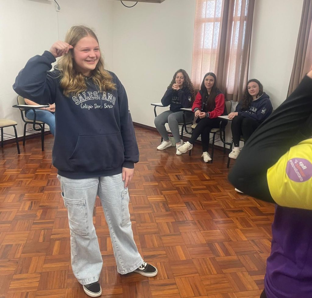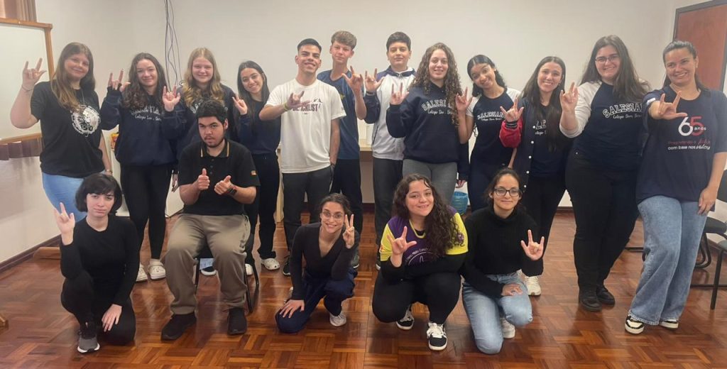 Durante o ano, os integrantes da AJS se prepararam para apresentar-se em LIBRAS (Língua Brasileira de Sinais) e encerraram o encontro com um momento de espiritualidade: a leitura bíblica de Romanos 8, 31-39, acompanhada pela interpretação em sinais. 📖✨