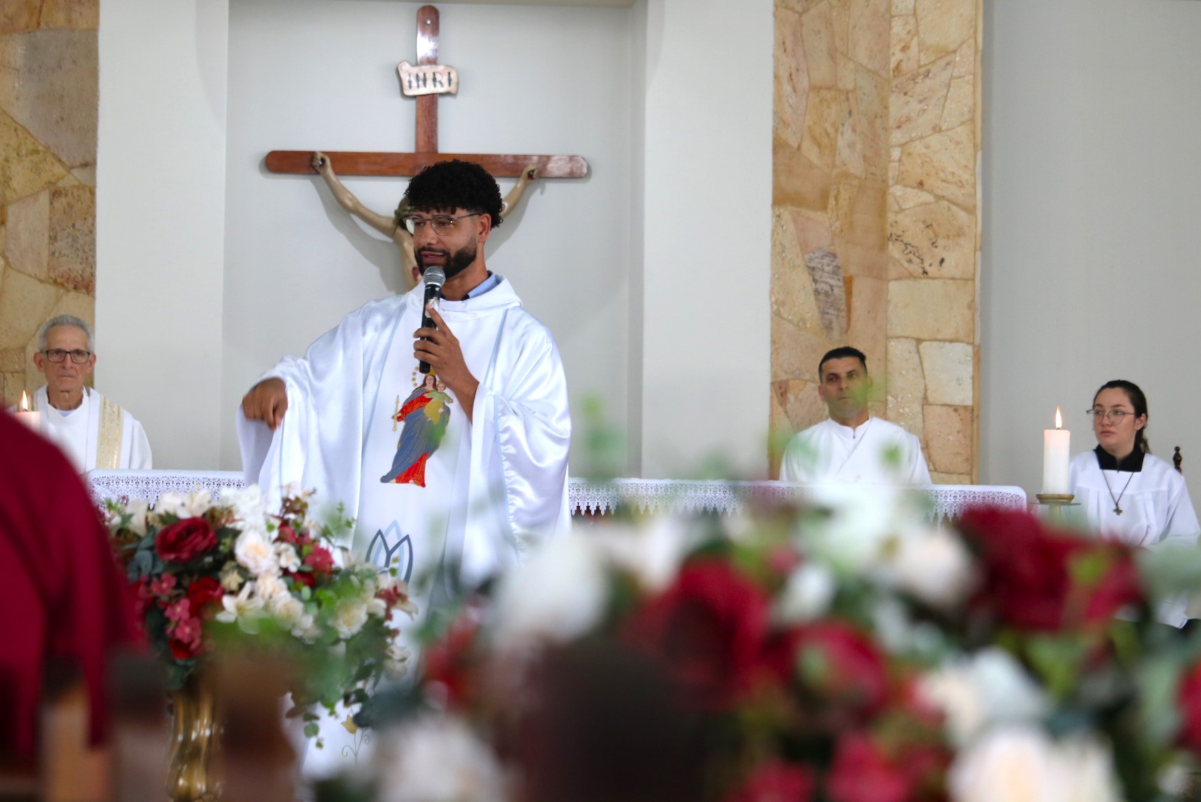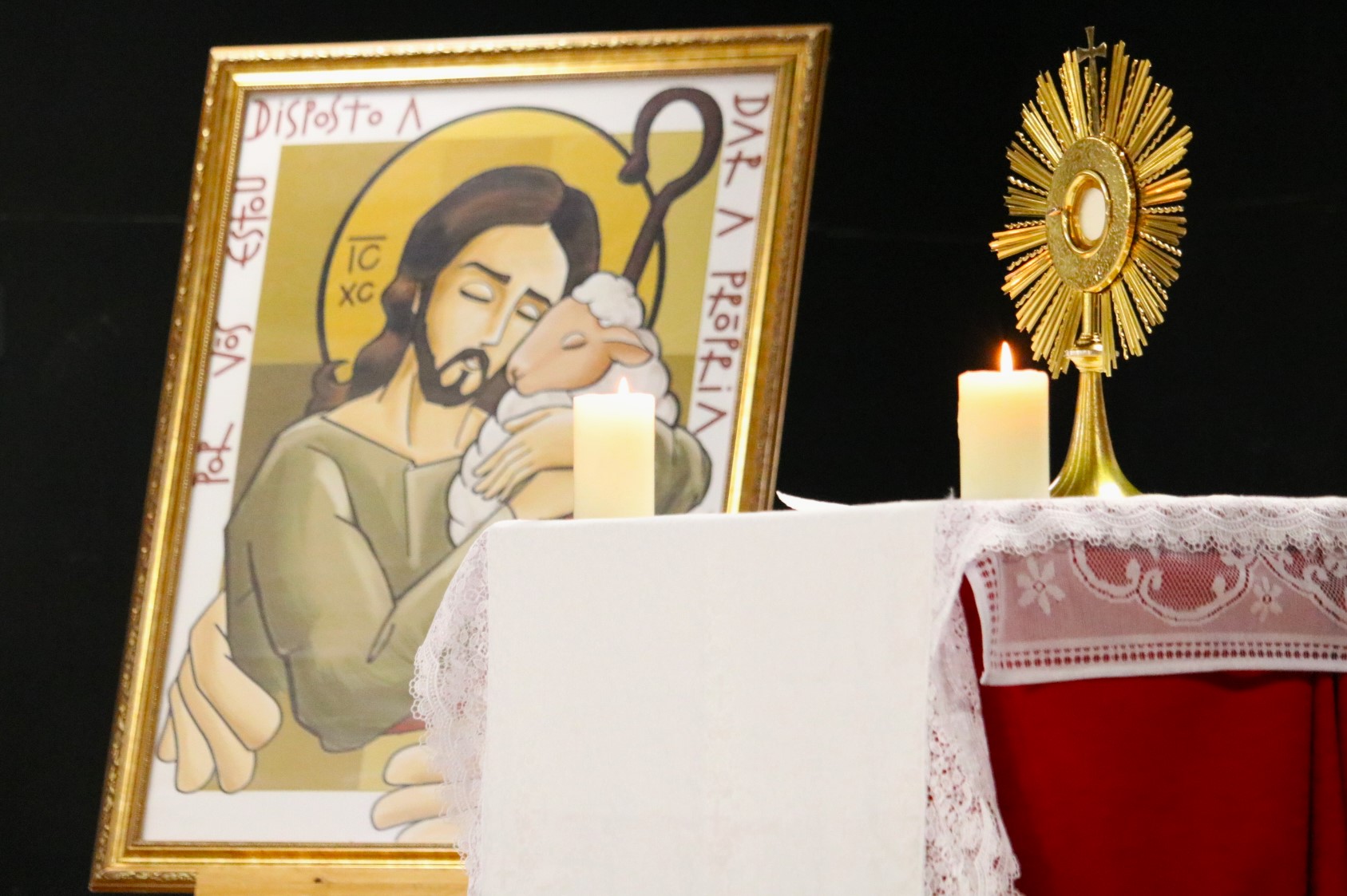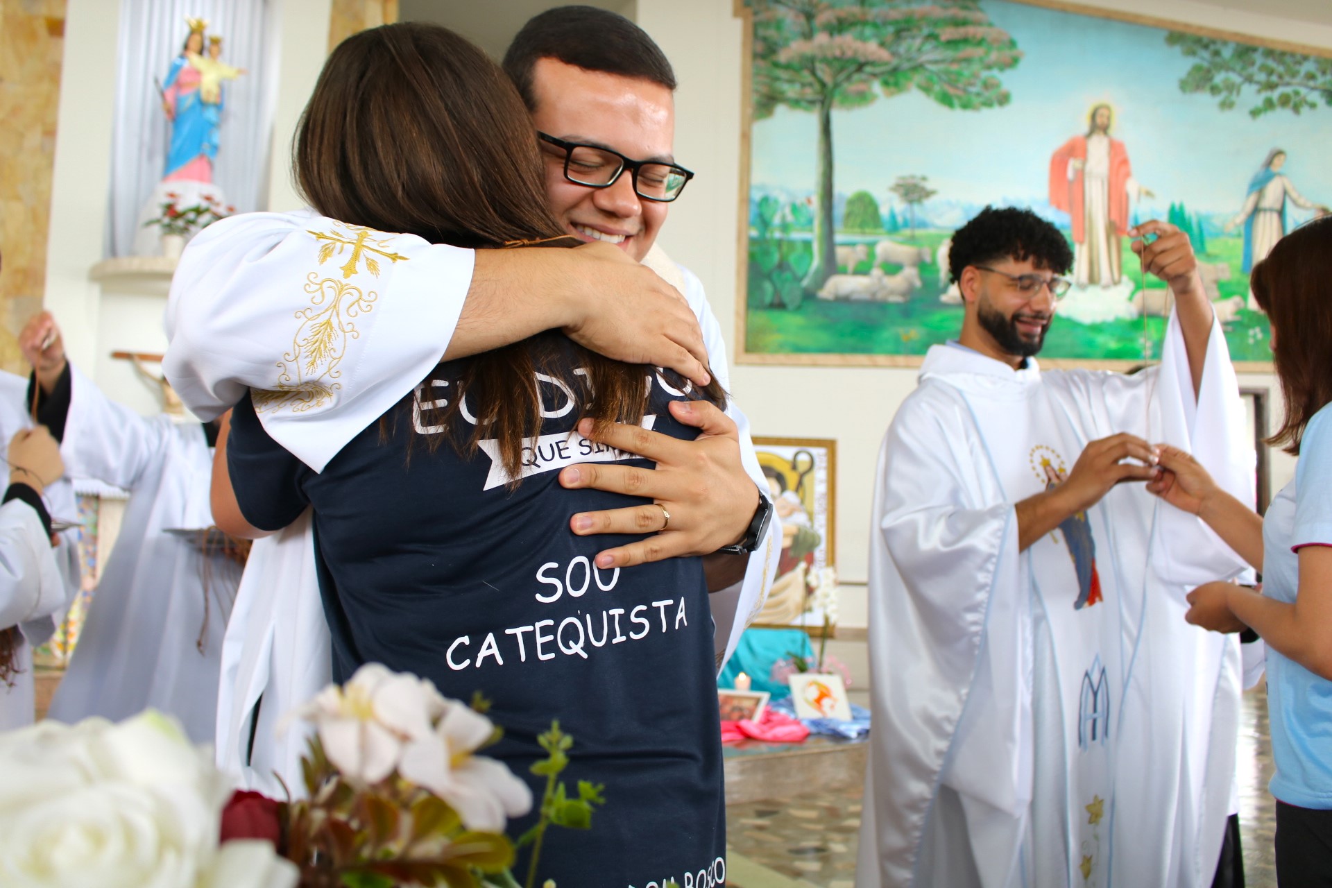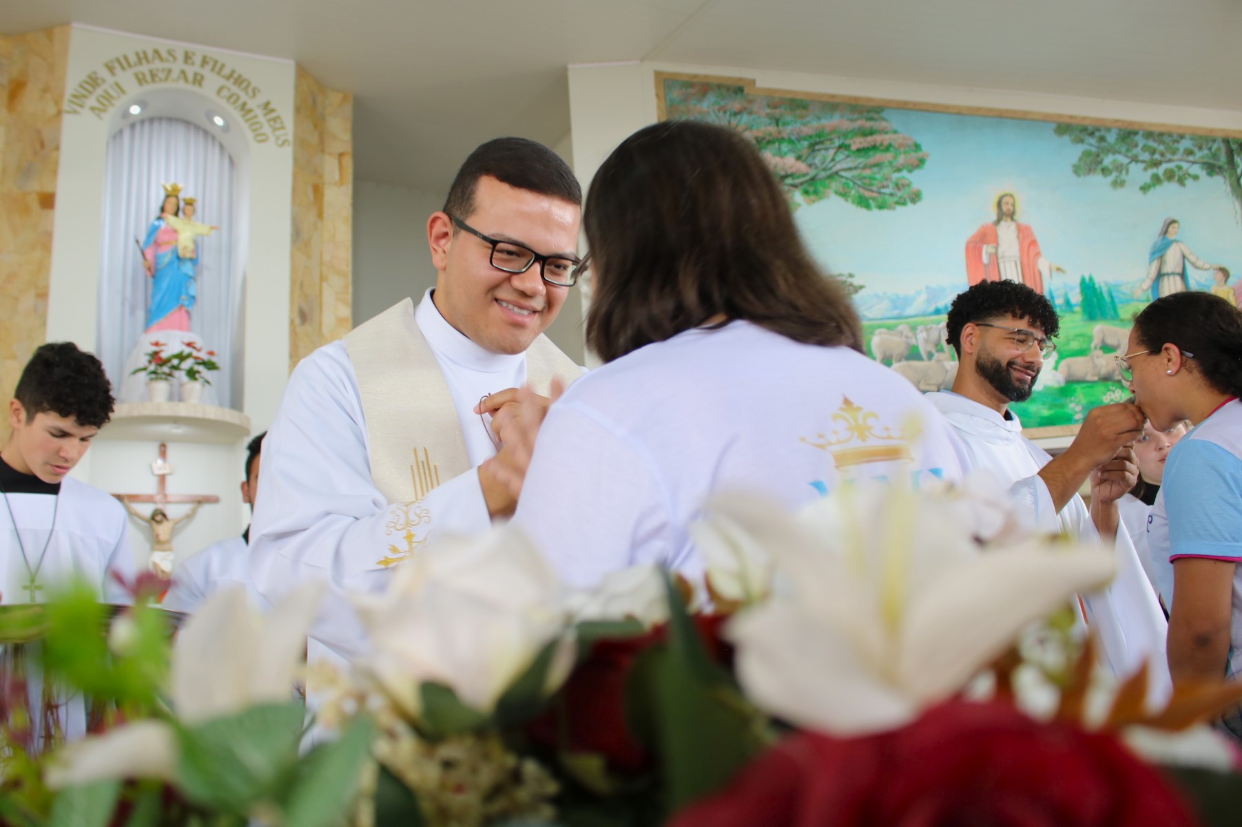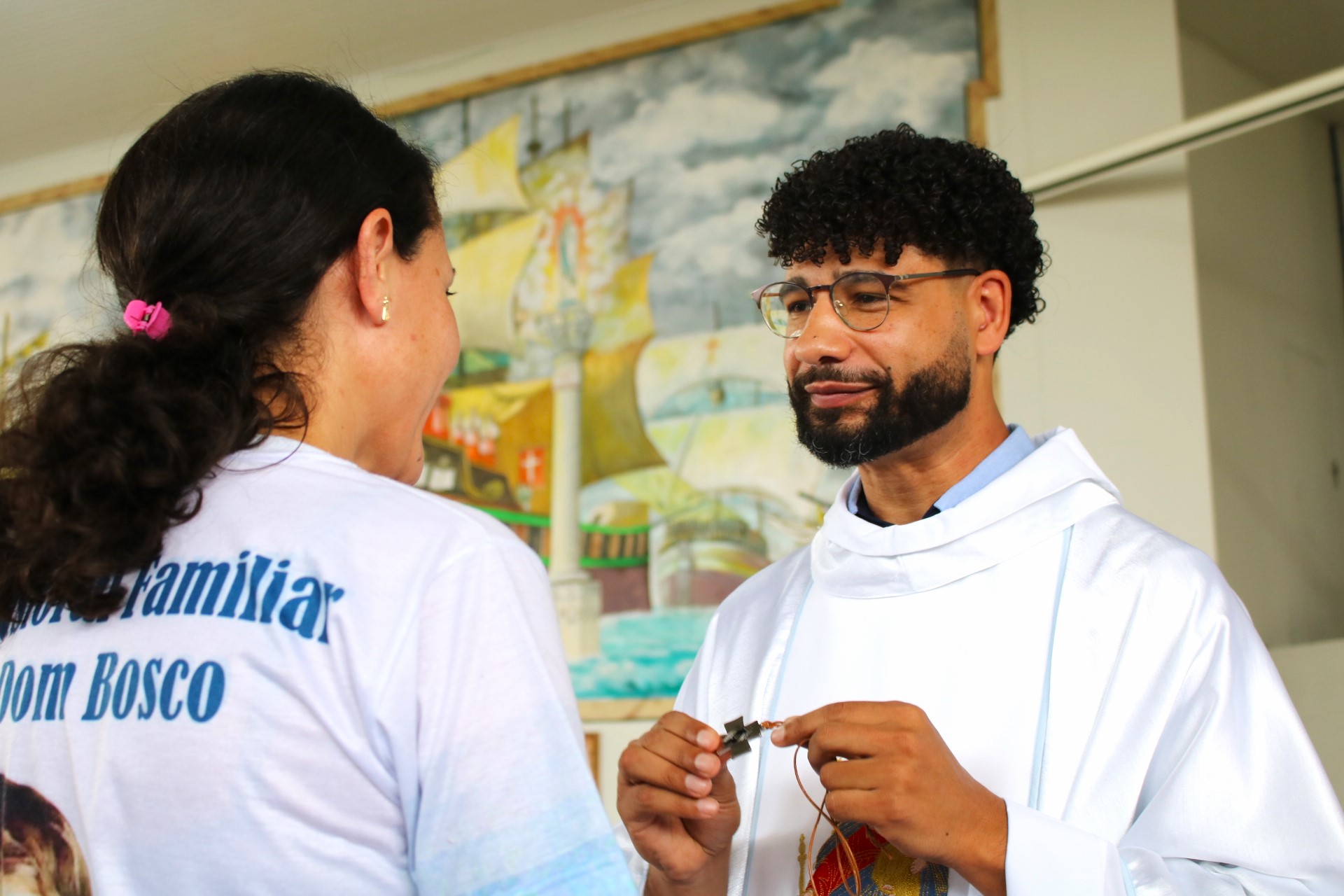 A missa abriu o encontro e foi presidida pelo P. Sérgio Ramos de Souza, vice Inspetor e Delegado pela Pastoral Juvenil Salesiana da Inspetoria São Pio X. Durante a celebração, os catequistas receberam uma cruz simbolizando o compromisso catequético com a espiritualidade salesiana de nossos catequistas no Sul do Brasil. A cruz estampa em um lado o perfil de Dom Bosco mirando um jovem, simbolizando a relação catequista e catequizando. No outro lado, o lema de São João Bosco “Da mihi animas”, destacado por P. Sérgio na homilia como a opção de Dom Bosco pelo: “Dai-me vidas”.
