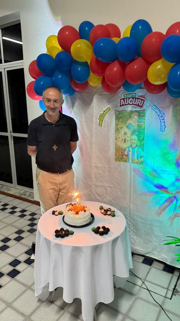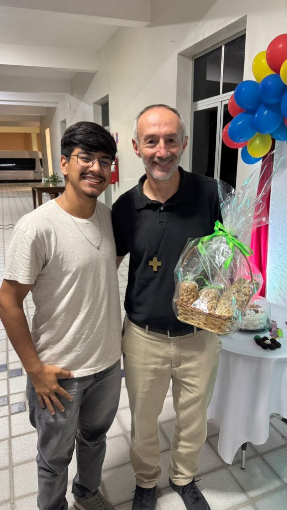 Ao final do dia, a comunidade celebrou o aniversário do P. Gabriel, que comemorava seu aniversário natalício no dia seguinte. O Noviço Gustavo Eduardo do Nascimento, da Inspetoria Brasil-Porto Alegre, entregou um presente ao Conselheiro Regional em nome da comunidade.