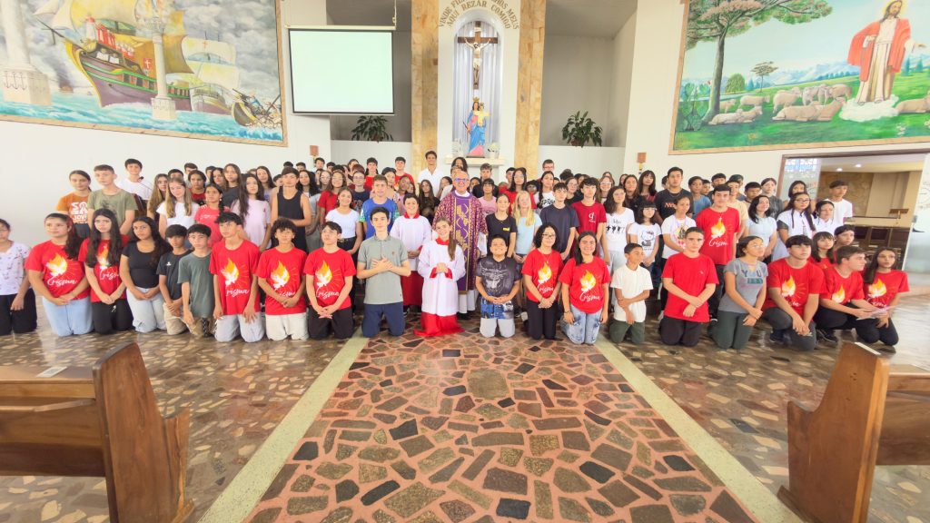 Um dos momentos mais significativos ocorreu quando os crismandos se aproximaram do altar, formando um grande círculo ao redor dele. O gesto simbólico expressou que a catequese é, antes de tudo, um encontro vivo com Jesus Cristo e destacou o sentido mais profundo da caminhada: não apenas um percurso pelas ruas, mas um caminho interior de conversão, fé e compromisso com a vida cristã.