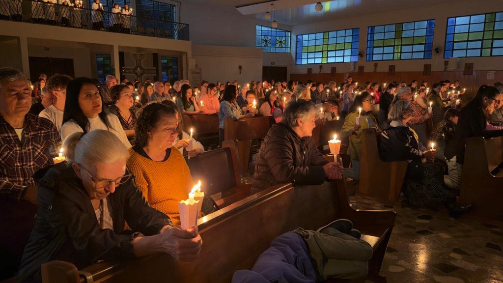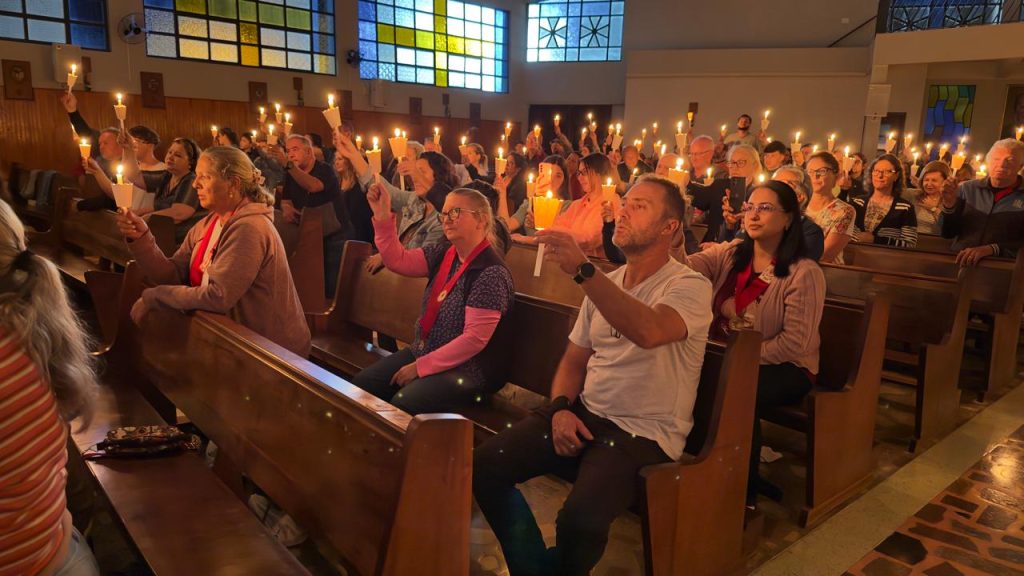 “Saímos daqui fortalecidos. Foi uma noite de graça, de luz e de reconciliação com Deus”, testemunhou dona Karine da Rosa, que participou da missa com seus dois filhos.