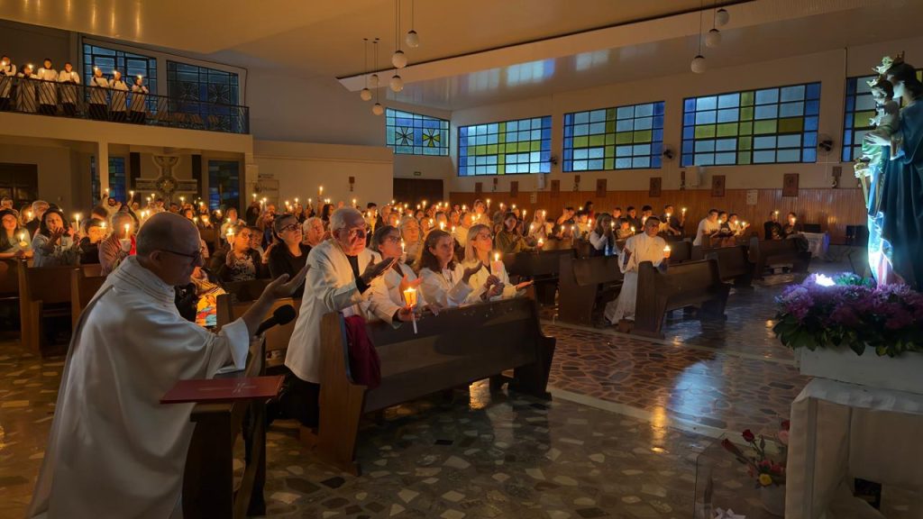A celebração teve início com um momento de Adoração ao Santíssimo Sacramento, seguido pela bênção solene. Um dos momentos bonito da noite foi a entrega das velas às famílias, símbolo da luz de Cristo que deve iluminar cada lar. Com as velas acesas, a assembleia participou emocionada da renovação pública da Consagração à Nossa Senhora Auxiliadora, Padroeira da paróquia.