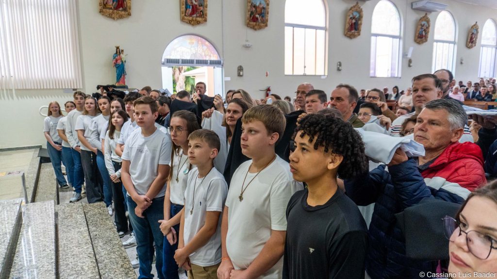 Os pais e padrinhos, convidados a se aproximarem, receberam as vestes, que foram abençoadas pelo pároco, e ajudaram a revestir os novos acólitos. Depois, padre Tarcizio dirigiu-lhes algumas perguntas sobre a missão que assumem e os enviou com uma oração especial, pedindo que vivam esse serviço com o espírito salesiano, inspirado no exemplo de Dom Bosco e São Domingos Sávio, padroeiro dos acólitos salesianos. “Que nunca falte o sorriso, o respeito e o compromisso com Jesus, presente na Eucaristia e nos irmãos”, exortou o pároco.