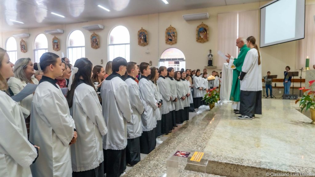 Novos Acólitos da Comunidade Paroquial Sagrado Coração: Gustavo Oliani, Brendo William Ribas Dias (S. Domingos Sávio – Patrimônio); Nathan Ariel Siewerdt e Tainá Yasmin Novak (N.S. das Dores (Treze de maio); Taila Luana Wacholtz, Alice Kemczinski Besen e Emily Kraisch Bordin (Bom Pastor); Davi Deretti Ranghetti, Tiago Lofhagen , Antonio Marcos Bramorski da Silva, Maicon Davi Petry e Samantha Correia Krutzsch (N.S. Auxiliadora – Centro); Sarah Gabriella Ferreira Galvão (N.S. da Glória); Jéssica Leandro, Giovanna de Oliveira e Emanuele de Oliveira (Santíssima Trindade); Cristian Jacob Behmke Kasmirski e Paola Sofia Tribess (N.S. Rosário – Braço do Norte); Julia Sofy Cisz Bublitz, Manuela Galvao de Oliveira e Maria Luiza da Silva (Matriz); Isabela Luisa Jaroczinski, Lucas José Momm e Helena Besen (Ribeirão da Lagoa – Dom Bosco); Kauana Hafemann (N.S. Auxiliadora – Benjamin Constant); Amabile Ariela Carelli Pereira, Stela Lazaris e Stefani Lazaris (Primeiro Braço – Santo Antônio); Ricardo Emanuel Sanabria (Segundo Braço – N.S. Saúde).